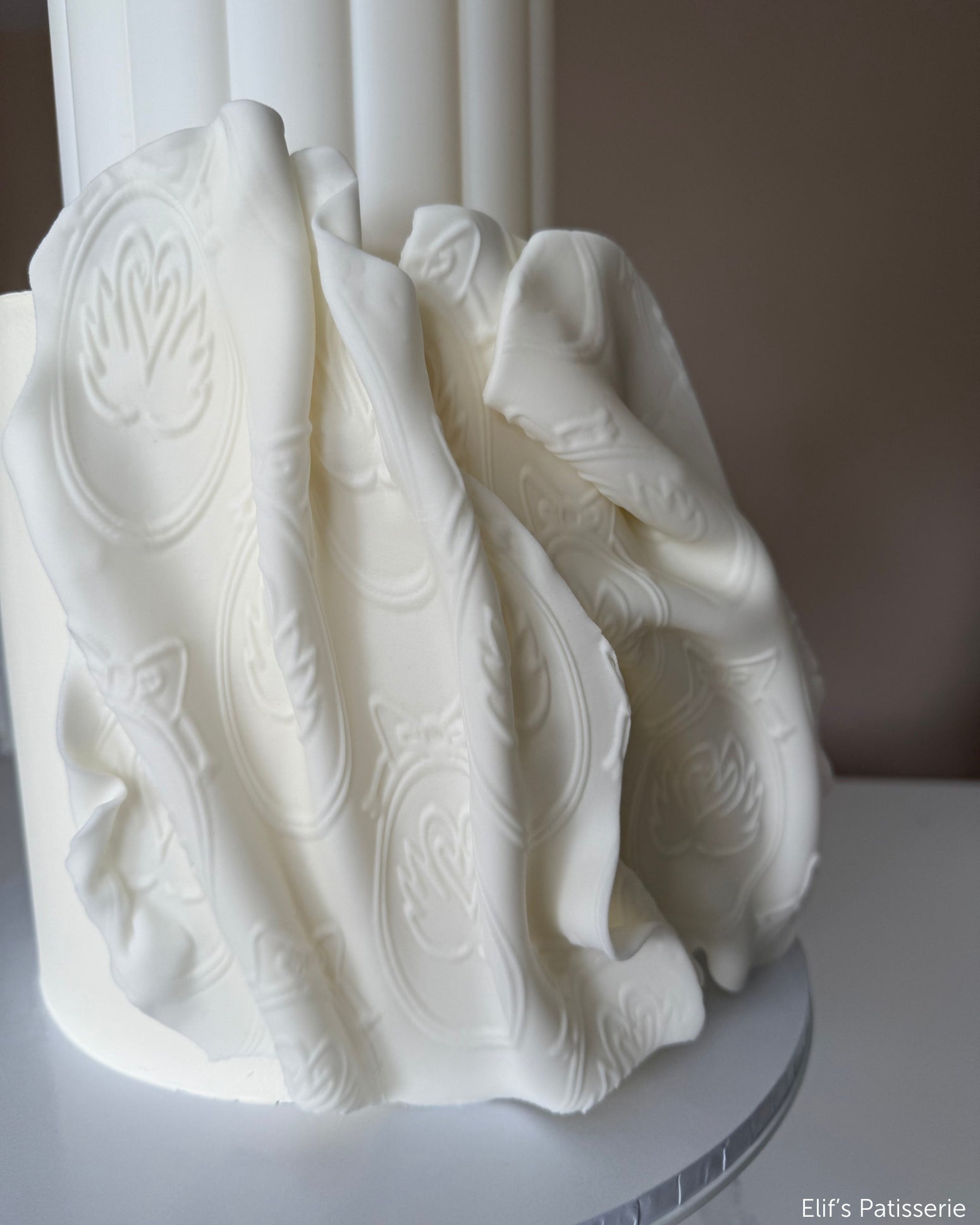 Pair an intricately textured top tier with a simpler lower tier, separated by a spacer that echoes classical form. The contrast elevates both elements and keeps the design modern rather than nostalgic.