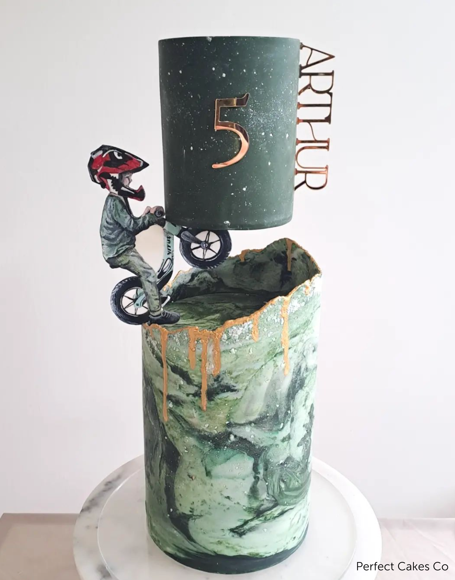 Another cracking design from @perfectcakesco, this time creating a fabulous bicycle illusion. Greens and golds add a sophisticated touch to this fun birthday celebration!