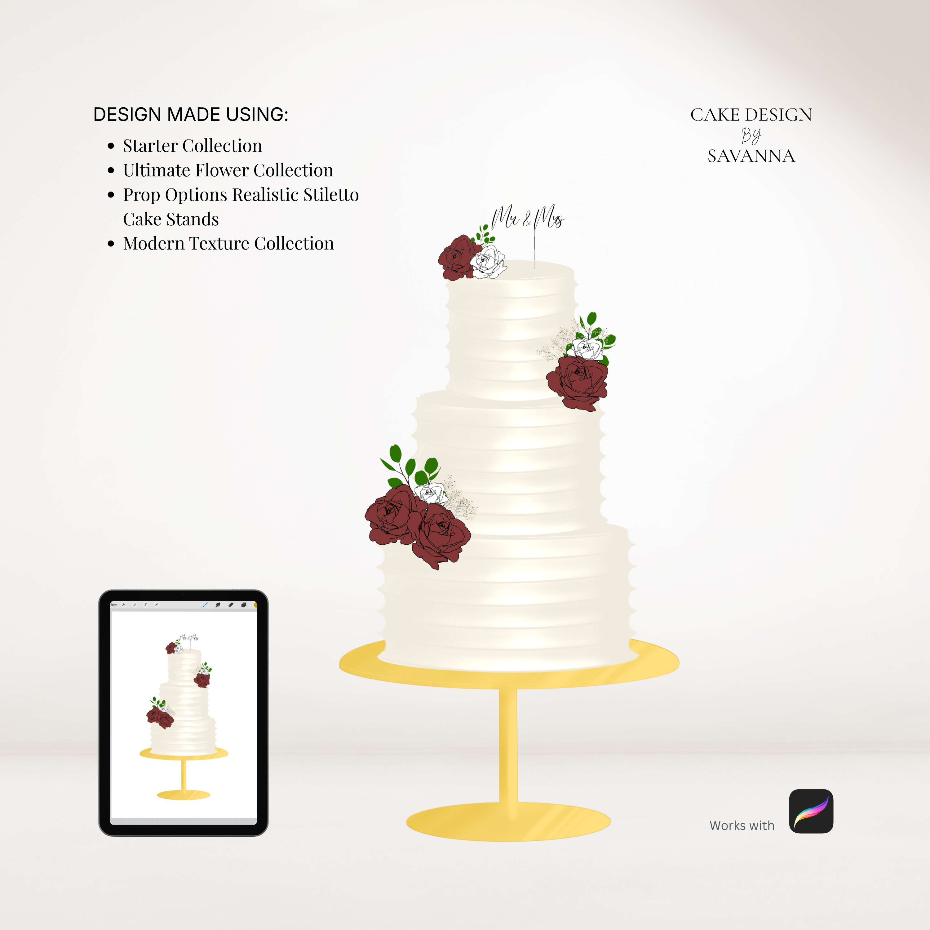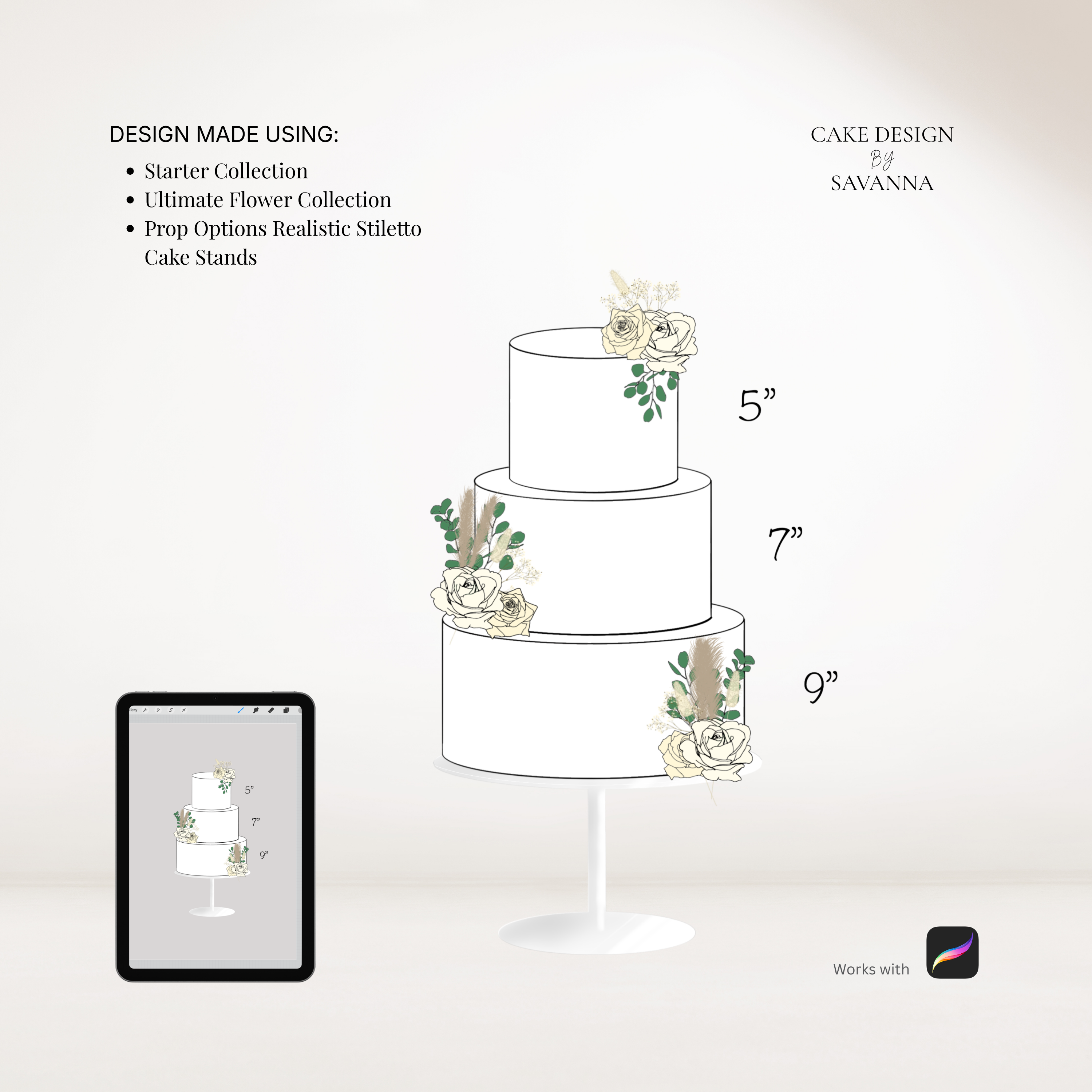 This brush pack contains realistic Procreate stamps of the Prop Options Stiletto Cake Stand in both round and square, including all available sizes. Designed specifically for cake makers who want their digital sketches to look polished, modern and client-ready.
