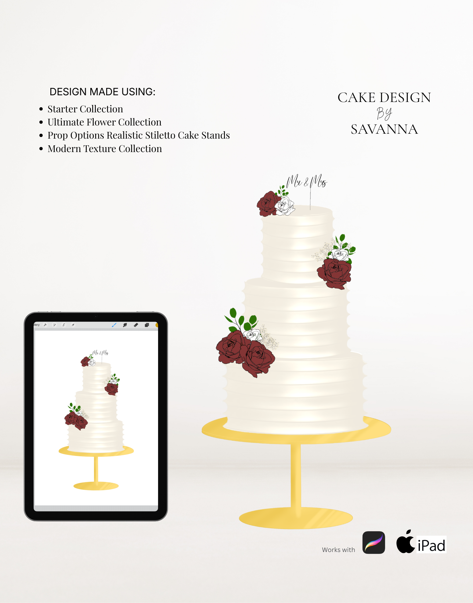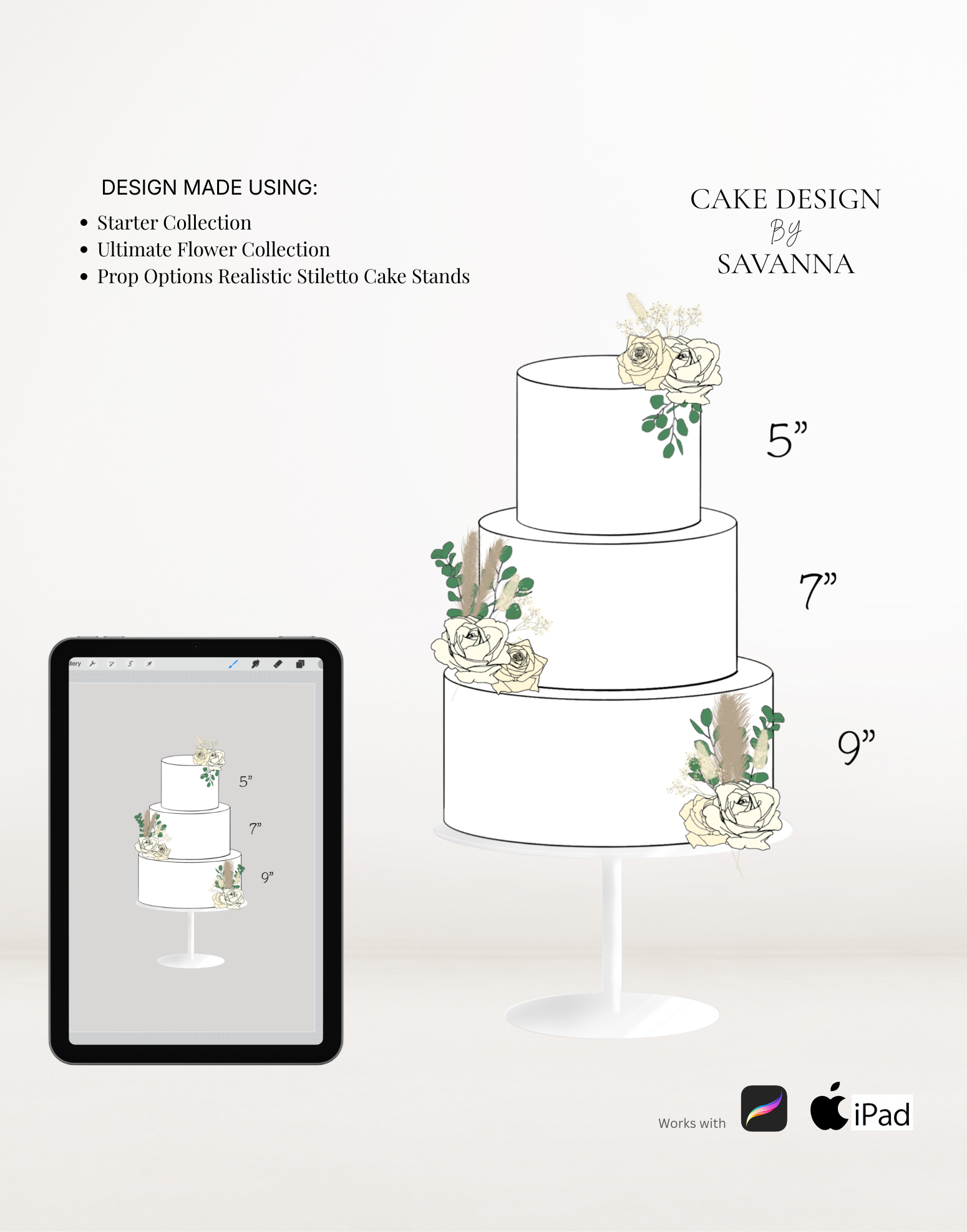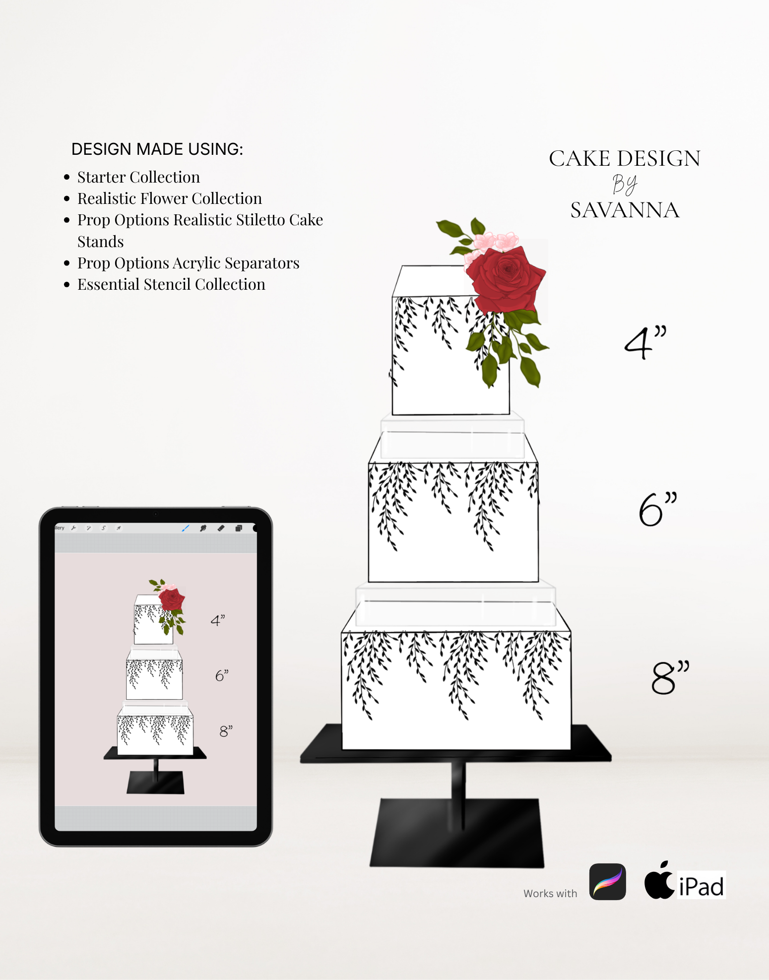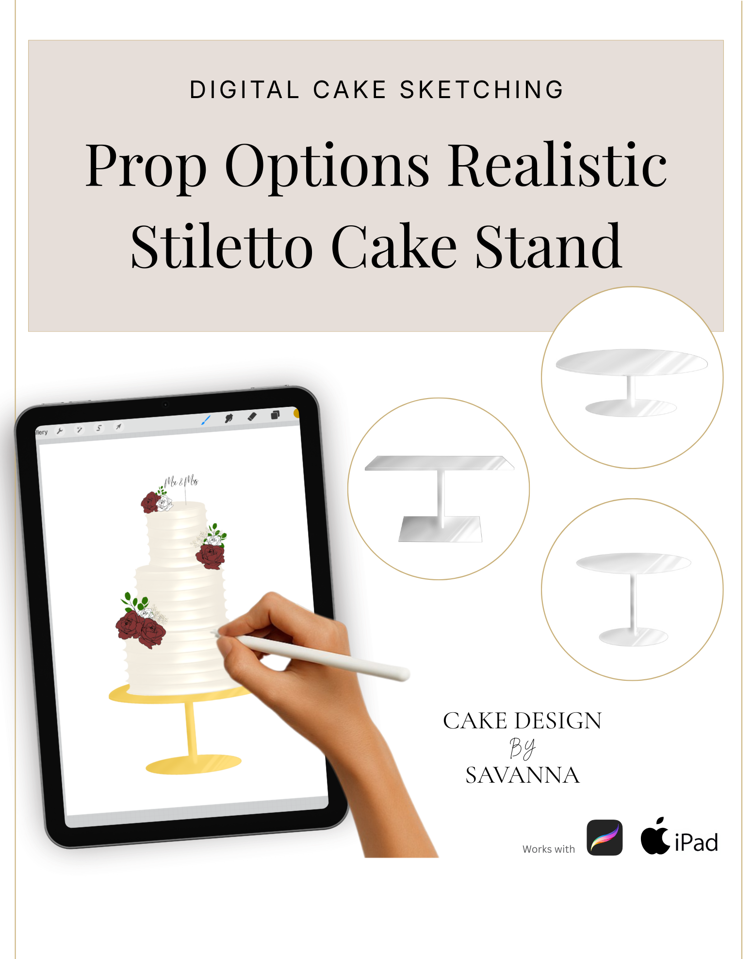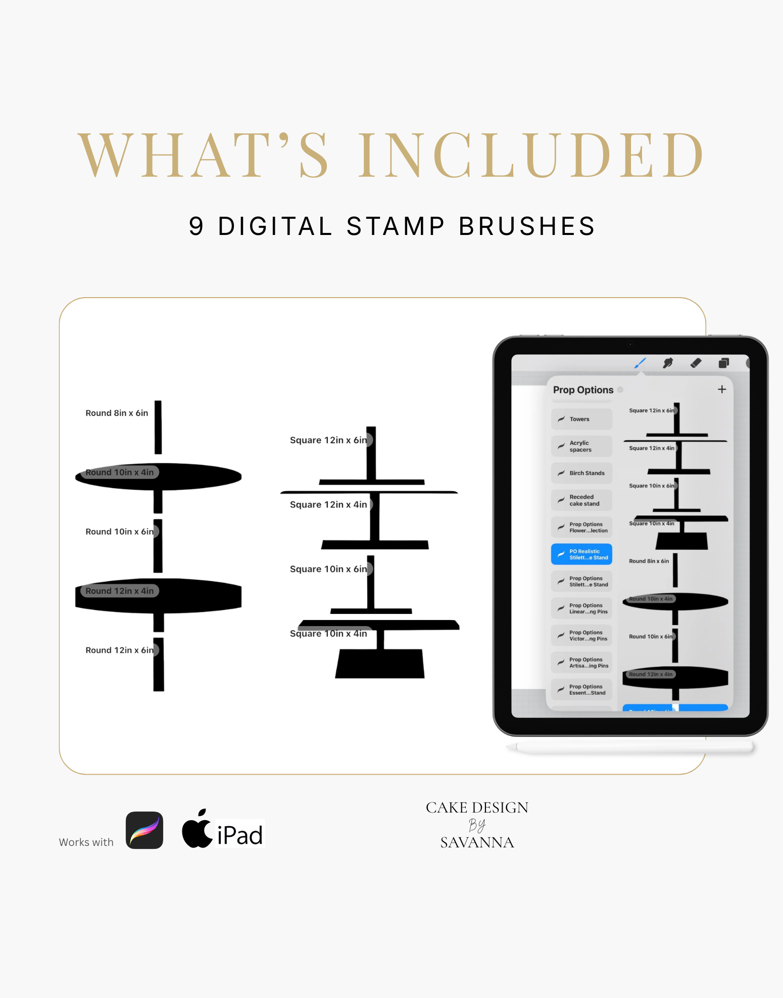 This brush pack contains realistic Procreate stamps of the Prop Options Stiletto Cake Stand in both round and square, including all available sizes. Designed specifically for cake makers who want their digital sketches to look polished, modern and client-ready.