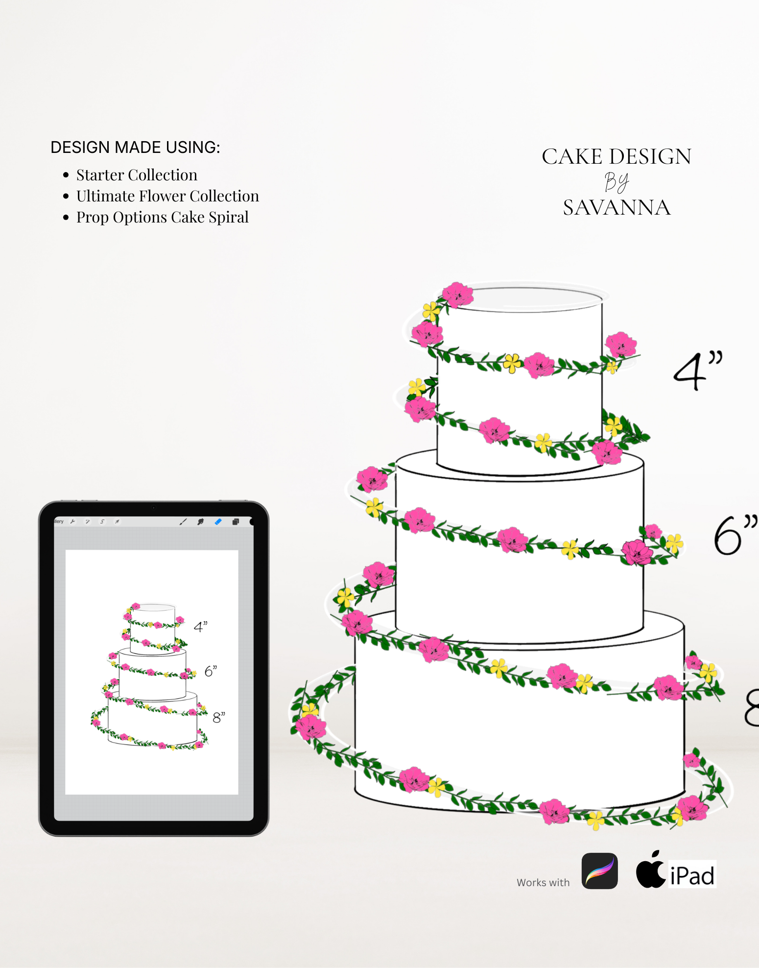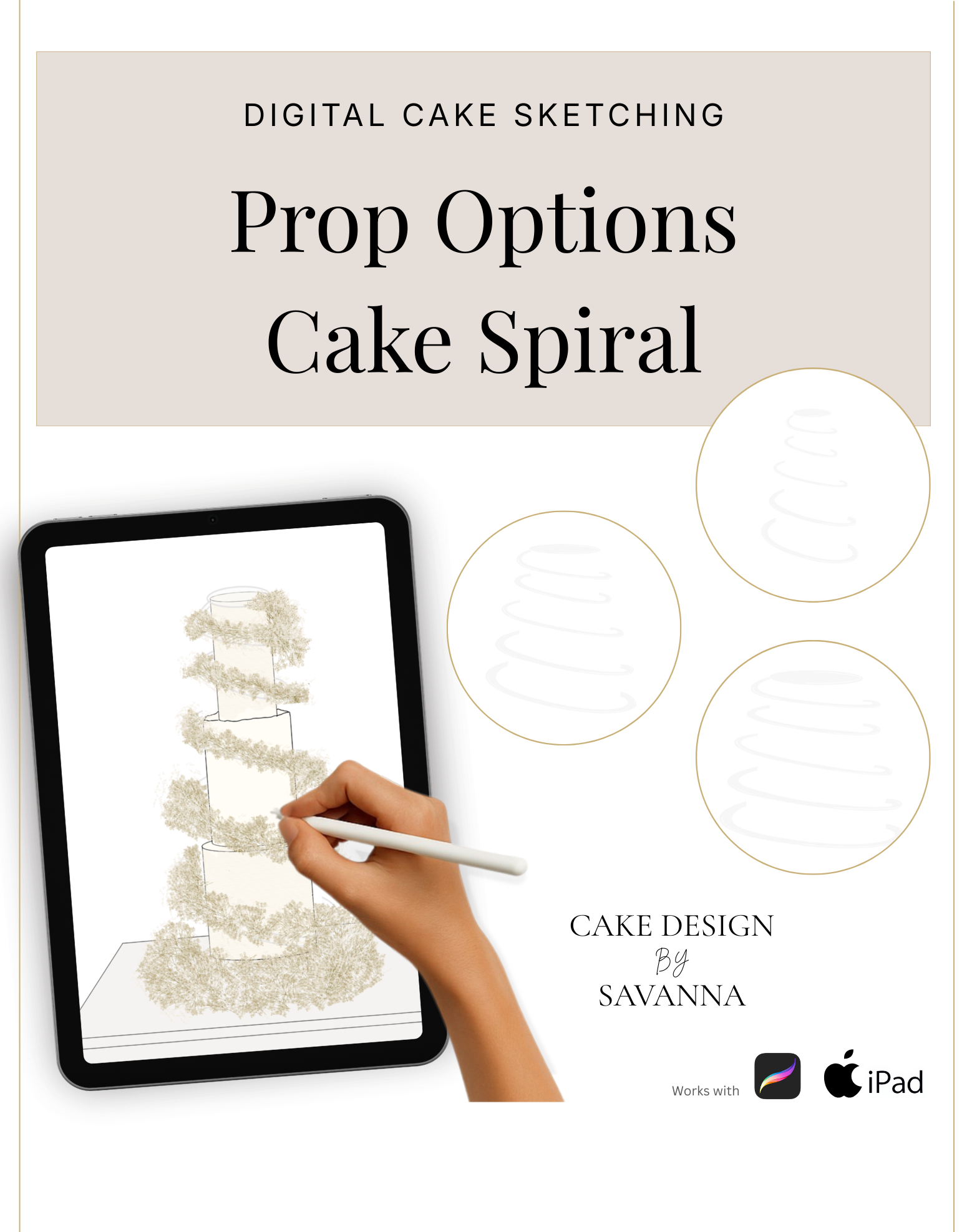 This Procreate stamp set includes 3 spiral stamps featuring the Prop Options Cake Spiral, designed for realistic wedding cake sketching with natural flow and movement.