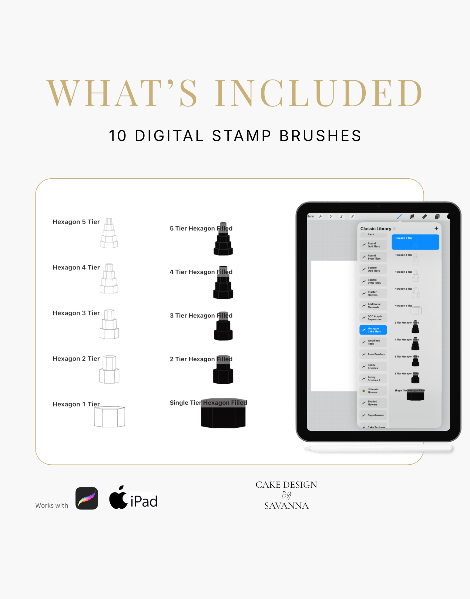 This set of Procreate brushes contains hexagon shape cake tiers. From a single tier, up to 5 tiers.