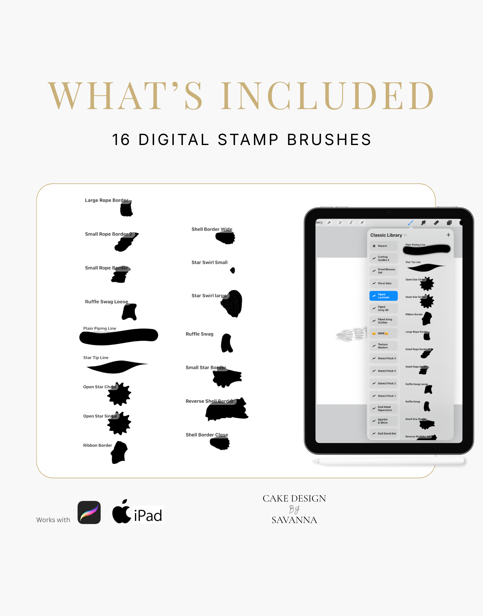 This Lambeth style buttercream piping procreate brush set is easy to use, and creates modern designs. With a mix of stamps and brushes, you can eailty create the Lambeth style of cake design. the stamps and brushes are dual colour, meaning there are shadows and highlights built into the stamps. simply choose 2 colours (a darker and a lighter) and start stamping.