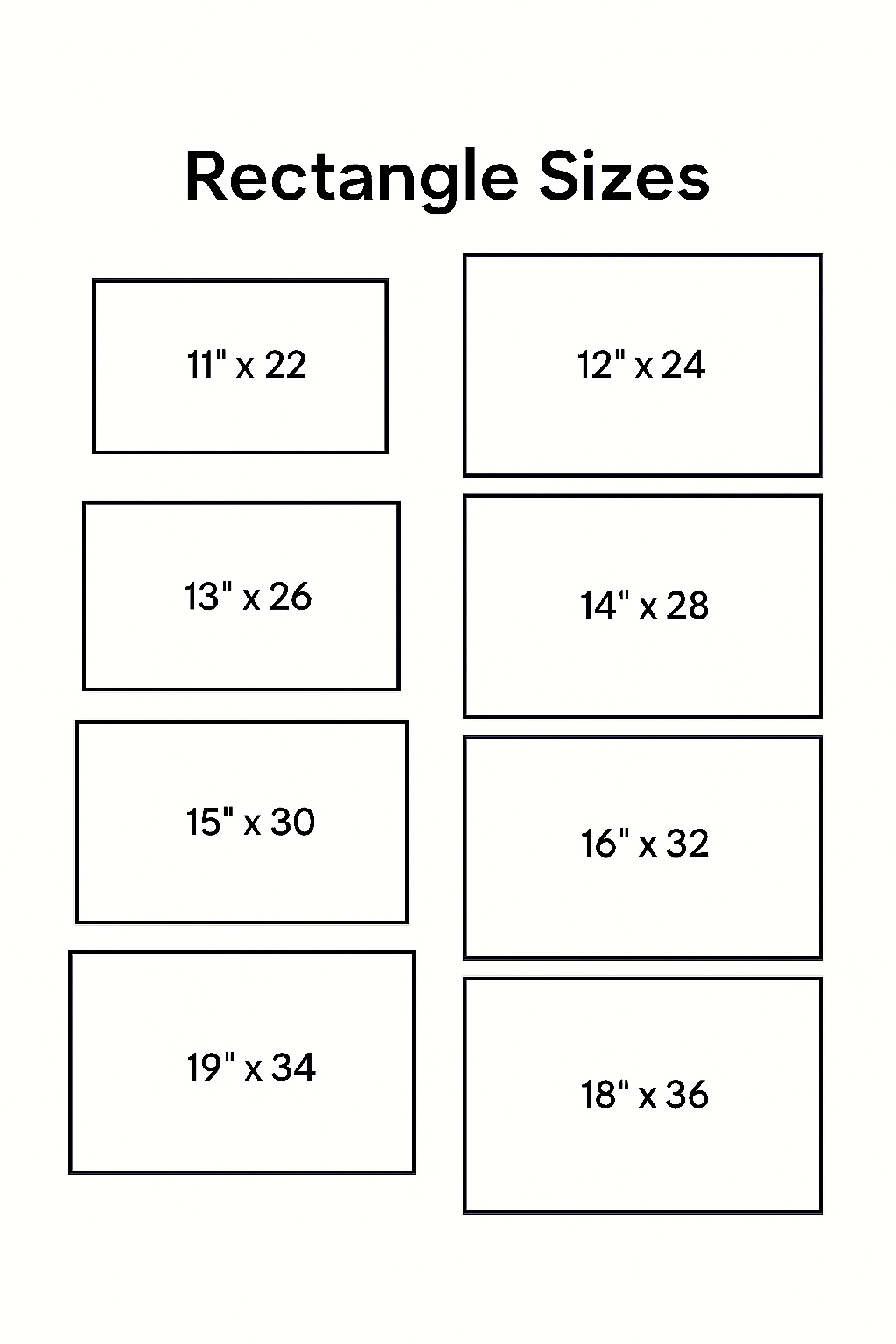 Rectangle: Dimensions listed as width x depth — see image for exact visual size references