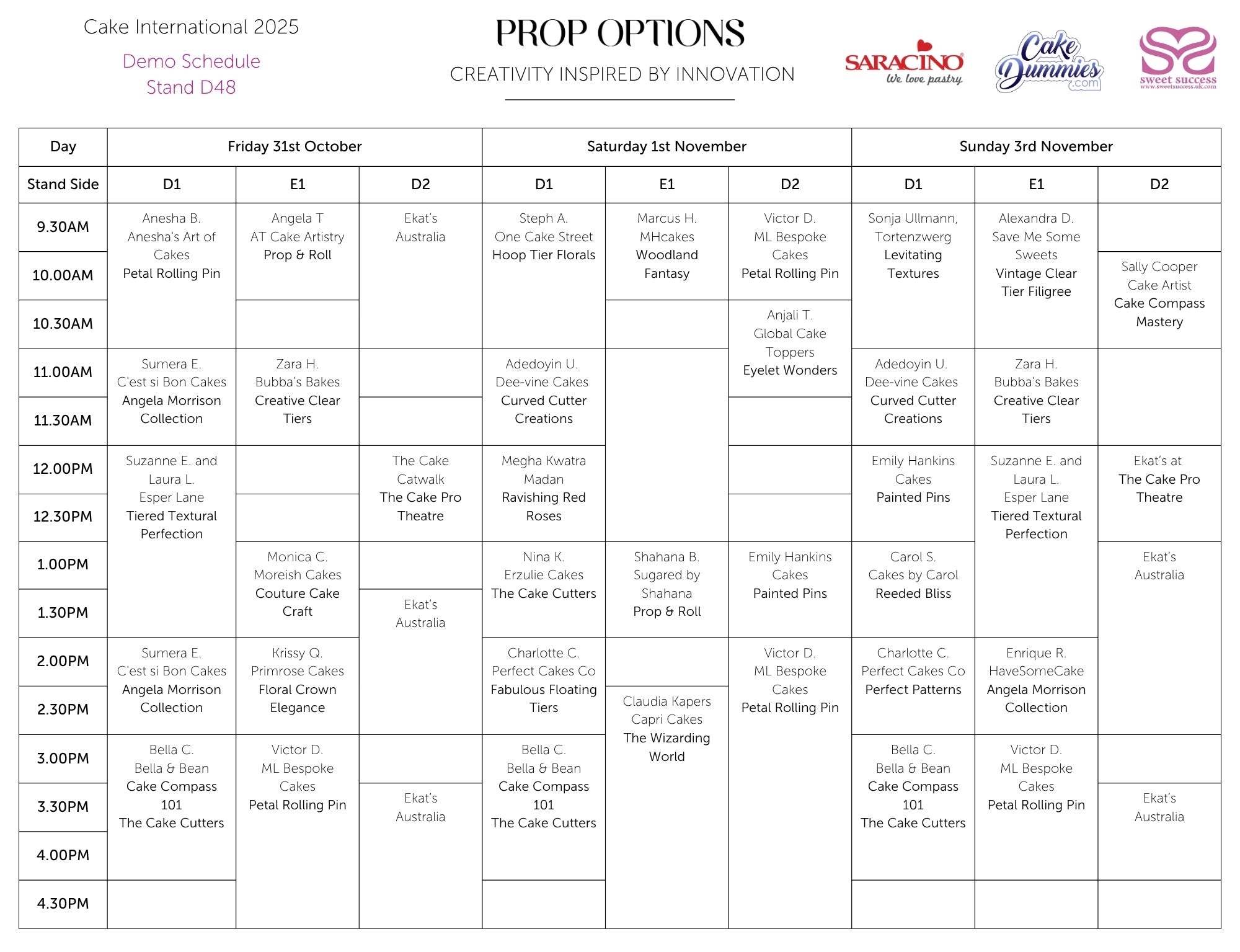 In celebration of CI's 30th birthday, the Prop Options team took over the entrance for a social extravaganza! Plus, the party continued with a visit to our exhibition stand located at D48 just inside the entrance directly behind our show-stopping cake, where an array of interactive displays and an incredible international line up of your favourite cake artists, sharing their expertise whilst demoing our products! Catch up on all the details below from Cake International 2024!