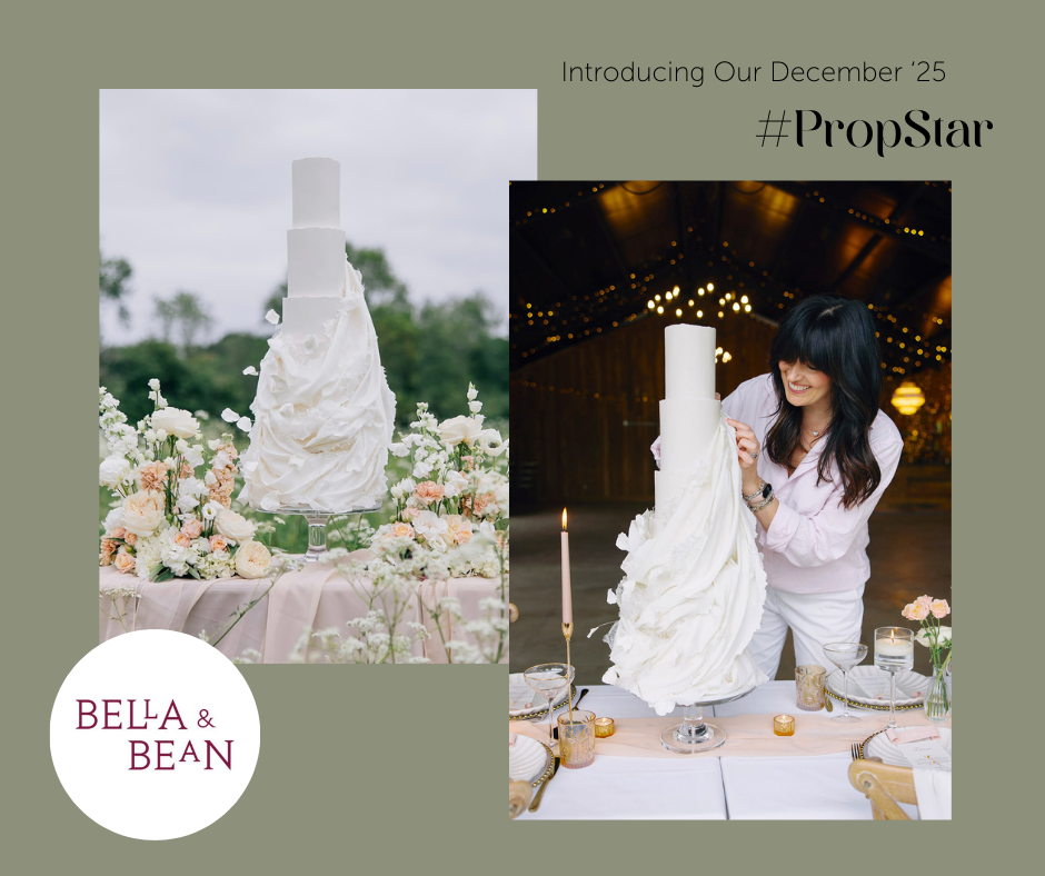 This month’s Prop Star goes to Bella & Bean Cake Design, renowned for her refined modern style and effortlessly elegant creations. Each of Bella’s cakes is beautifully composed, blending clean lines, subtle textures and artistic balance to create timeless designs. We love how she brings our Prop Options pieces into her work, using them to elevate her vision and complete each display with sophistication. Her cakes capture everything we admire about contemporary cake artistry. Graceful, distinctive and full of creativity.We’re incredibly proud to feature Bella & Bean as this month’s Prop Star.